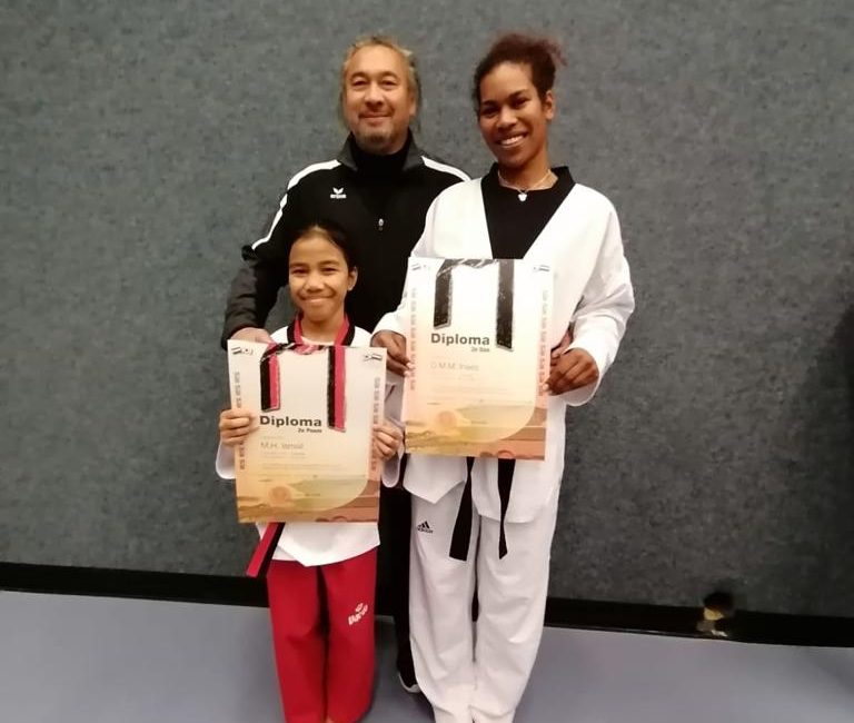 Nieuwegein – vanaf vandaag mag onze sportschool zich weer 2 Dannen rijker prijzen. Deze ochtend toen de meesten van jullie zich nog eens lekker omdraaiden in bed, hebben Malika en Damaris meegedaan aan het Nationaal Dan examen in Nieuwegein. En met succes; beiden zijn geslaagd voor de 2e Dan!